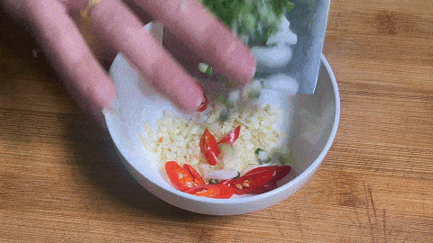 2. 剁好放入小碗中,小米辣洗净切成圈形