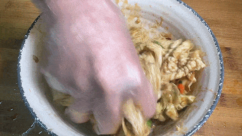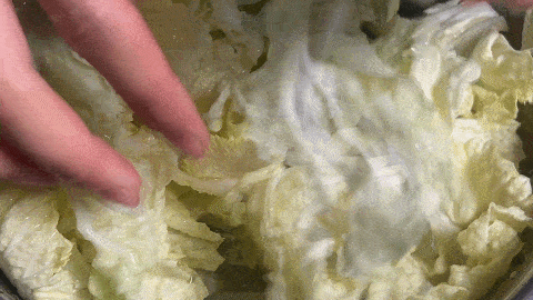 4、 将料汁加入到挤干水分的白菜叶中,用手抓拌均匀