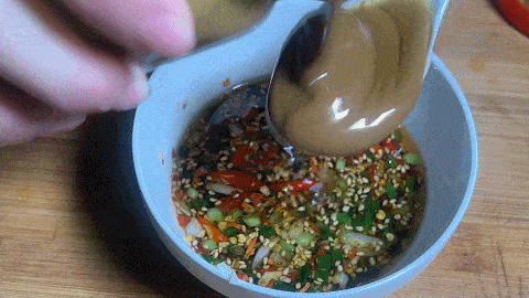 7. 接着加入一勺半芝麻酱,用勺子搅匀,凉拌汁制作完成