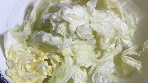 1、 将白菜叶放入盆中清洗干净,用手掰成小块,挤干干水分放入大碗中