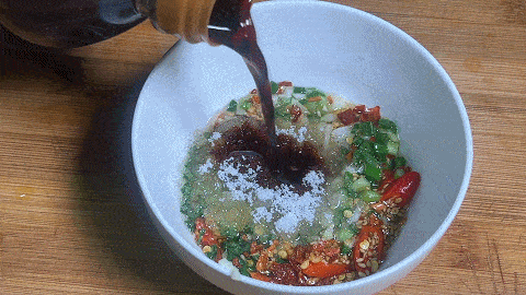 5. 将滚烫的热油浇在上面激出香味,加入食盐,味精,白糖