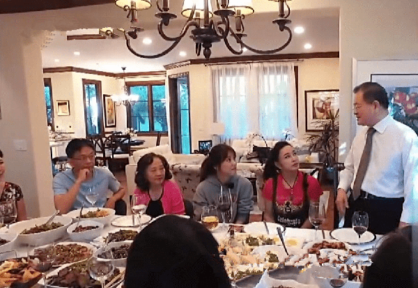 而且家里面聚餐可以看到吃的东西还是比较丰盛的,也是邀请了不少的朋友。她老公这个时候站起来了,穿的也是比较的得体。一件白色的衬衫搭配一条黑色的西裤,刘晓庆这个时候也是打扮的看起来比较的精致。