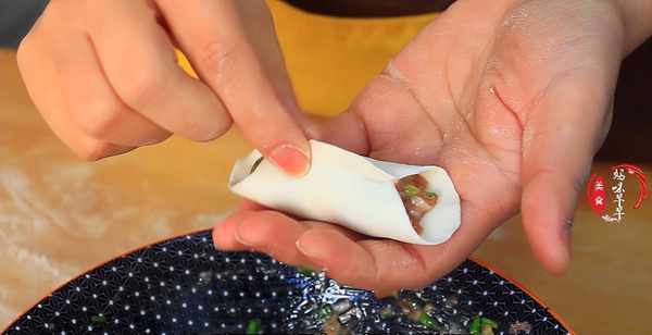 6、将肉馅放入饺子皮的中间,在饺子皮一侧抹上一些清水,然后将两边捏在一起,一个锅贴就做好了,也可以做成其他自己喜欢的样子,总之怎么开心怎么来。