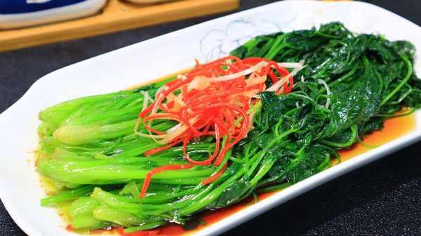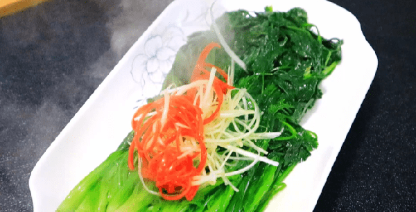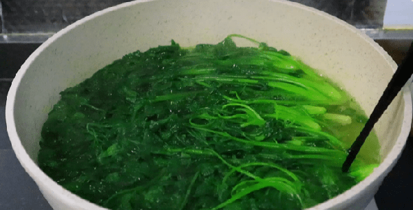 2、锅中烧水,水开后加一勺盐、一勺油,这是香菜不发黑的关键,然后下入香菜,焯水30秒左右即可,捞出摆入盘中。