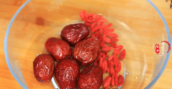 5,准备几颗红枣和一些枸杞,用清水浸泡上,煲的时候汤太少的话,可以再适量加一些开水,已经煲了一个小时了,鸡汤变得很浓白了,黄色的油漂浮在表面非常漂亮。