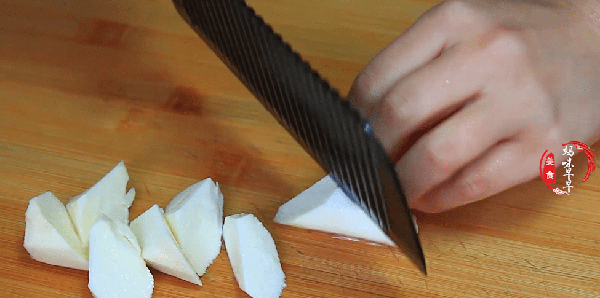 2,准备一根铁棍山药去掉皮,山药可以用热水烫一下,这样去皮就不痒了,去皮后的山药切成滚刀块,然后让入清水中备用。