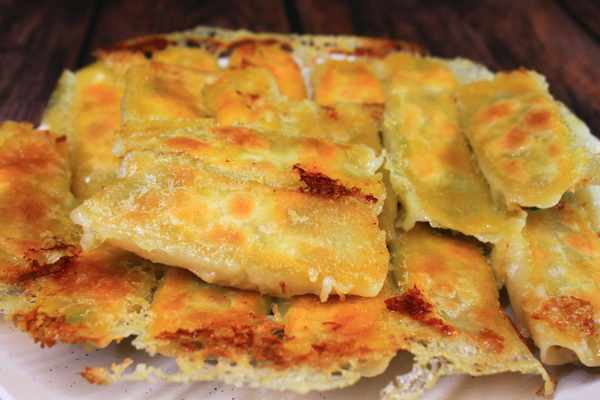 7、锅里倒入适量油,油热之后放入锅贴,小火先把锅贴煎到底部金黄,然后顺着锅边加入淀粉水,差不多倒锅贴的三分之一就可以了,盖上锅盖煎上8分钟即可。