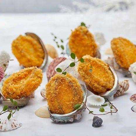 3. 把煨好的鲍鱼,拍上脆壳料,入4成油锅炸至金黄沥油;