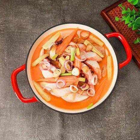 3. 煮好的酸菜五花肉白扁豆捞出装入铸铁锅,汤汁略收浓倒入铸铁锅,章鱼脚煎一下至略焦,切厚片码放锅中,装饰胡萝卜、玉米笋煮热即可。