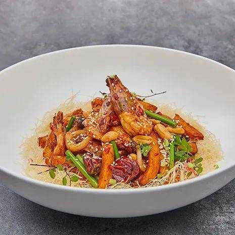 1. 将虾洗净、背部开刀,用热油炸熟;土豆条用热油炸熟;黑木耳飞水;