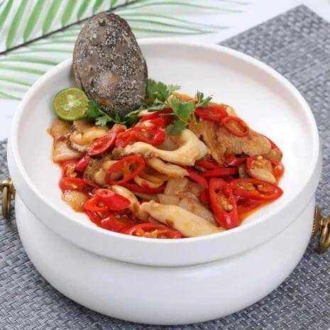 3. 起锅下猪油和五花肉片炒至微微卷曲金黄色,下入小料和海皇酱炒香,放入美人椒,烹入剩余调味和鲍鱼片,大火炒出镬气后装盘。薄荷叶点缀即可。