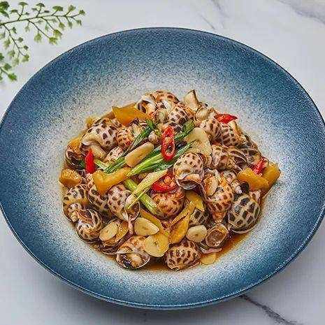 3.锅入底油,爆香小料加入菜圃,加入调味料煮开,放花螺加盖煮1分钟;