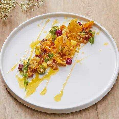 酸辣鲜露35克 浓缩鸡汁15克 橄榄油25克 芒果汁35克 白糖30克 9°米醋10克 苹果醋8克