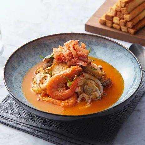 2. 锅留底油加入辣鲜泡菜汁烧开加入主料略煮捞出摆盘即可上桌配土司条。