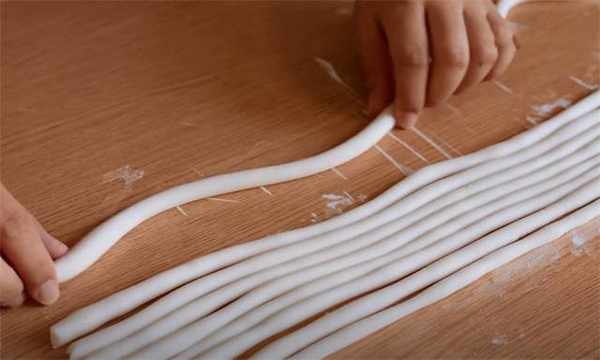 7.所有的长条都搓完之后我们开始切段。