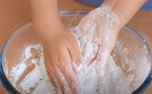 3.我们直接倒在糯米粉里面,前期搅拌的时候一定要多搅拌一会儿,等到完全融合的状态,我们再少量多次的放糯米粉,我加了大概有150g的糯米粉,搅拌到面絮的状态就可以揉面了,最后揉到非常光滑的面团就可以了。
