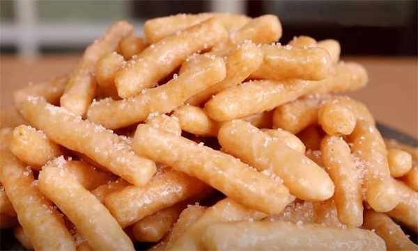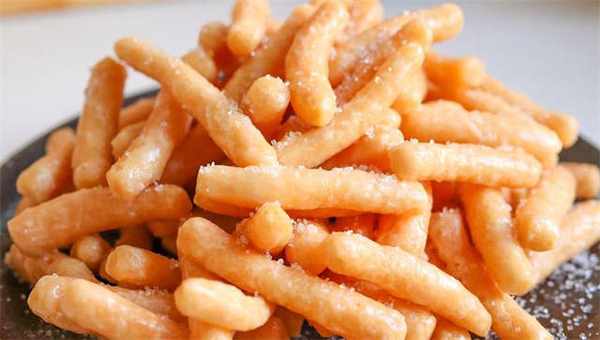 12.在表面撒一些白糖,我们这个江米条就做好了,和面水里放糖,可以让炸出来的颜色更好看,炸的时候一定要凉油下锅,全程保持中小火,在没有上色之前尽量少翻动它。
