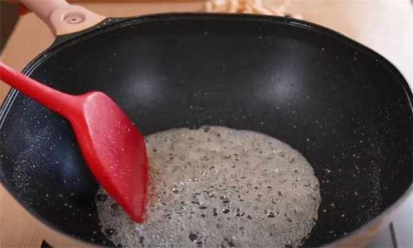 10.接着我们再来熬糖浆,50g的清水,60g白糖,把糖浆熬到非常浓稠,而且不断的冒气泡的时候,我们就要关火了。