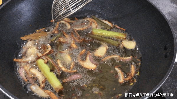 5、起锅,倒入500克食用油,放入葱段、姜片、花椒、八角、桂皮、香叶、洋葱、小茴香,用小火炸一会儿,炸出调料的香味,当所有食材都变得焦黄后捞出残渣,留下油备用。