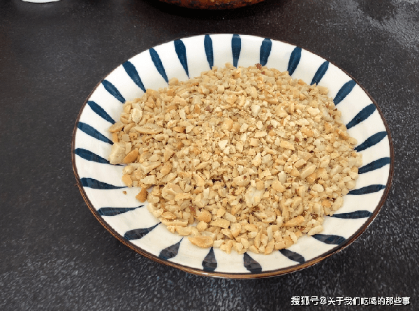 4、冷锅冷油放入花生米,小火炒一会儿,当花生的颜色变深,熟透后盛出,不要放在锅里,不然会糊掉的。等花生米放凉后,用杵臼把花生米捣碎。或是倒进保鲜袋里,用擀面杖擀碎。