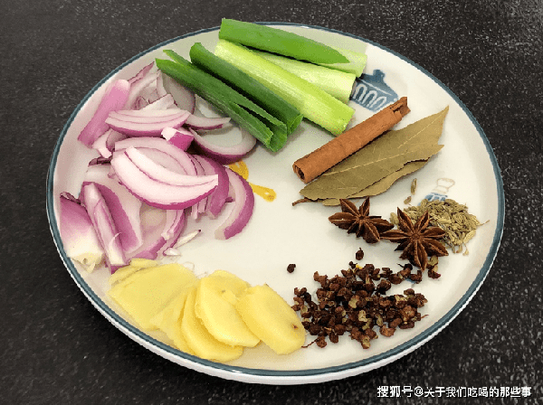 3、蒜瓣去皮,也丢进切碎机里绞成蒜末。生姜洗干净,切成姜片,大葱切段,洋葱切丝。花椒、八角、桂皮、香叶、小茴香用清水泡一泡,捞出沥干水分。