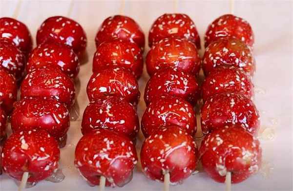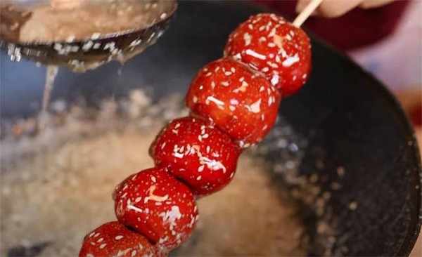 6.撒上一些白芝麻,然后把糖浆挂在山楂上,我们的冰糖葫芦就做好了。