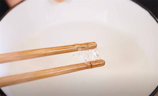 7.熬糖稀的时候,尽量避免用铲子来回翻动,不然糖稀会特别容易反沙,糖稀滴落到水里变硬,吃起来脆口不粘牙就可以了,如果发黏的话就要继续熬。