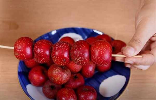 3.处理山楂的时候,直接把上面这个梗揪掉,再准备点比较硬的竹签子,我们直接从底部穿进去。