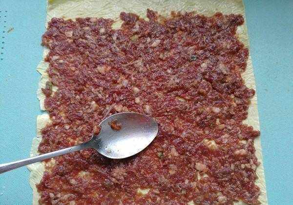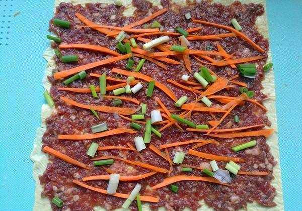 豆皮上铺上肉馅。