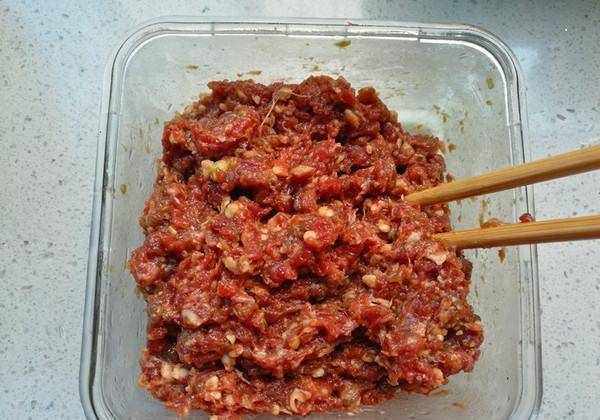 准备一碗牛肉馅,加入盐、生抽、蚝油、料酒。胡椒粉、鸡精、香油、葱姜末,搅拌均匀。
