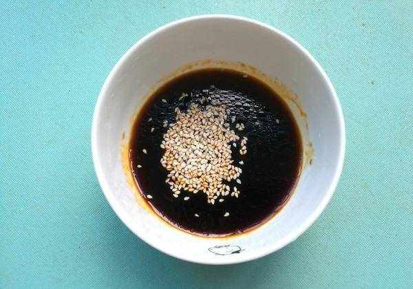 碗里放香醋、生抽、香油、少许白糖再放入几粒炒熟的白芝麻,搅拌均匀,蘸汁就做好了。