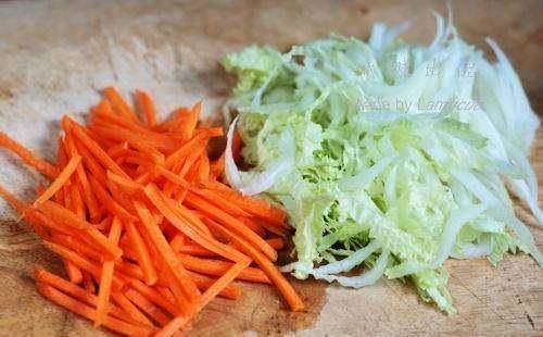 利用烧水的过程可以准备配菜。冰箱里只有胡萝卜与大白菜。各样来点切成丝