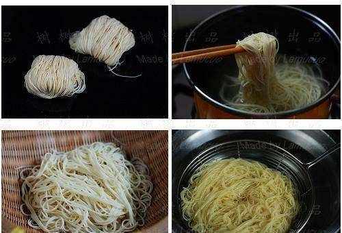 捞起的面条放凉水里过过冷河。