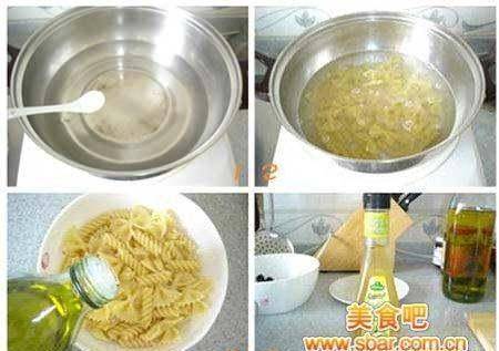 2、锅中烧开水,加少许盐,下面煮10分钟左右至熟捞出过冷水后沥干,拌入适量橄榄油备用。