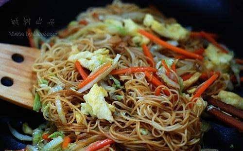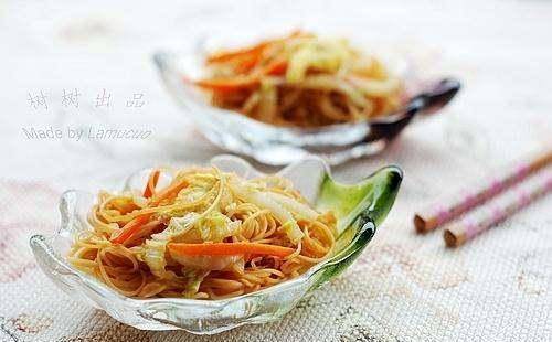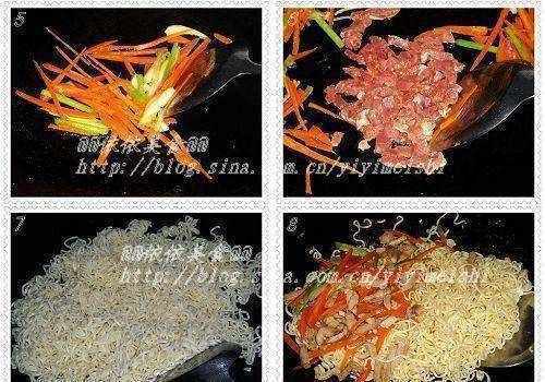 7:重新热油锅,放进沥干水分的面条翻炒1分钟;