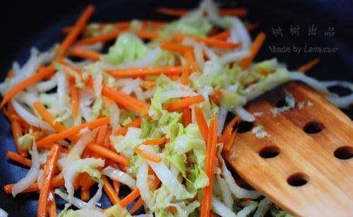 接着炒菜,先下胡萝卜略炒,然后放入大白菜继续炒至菜断生。
