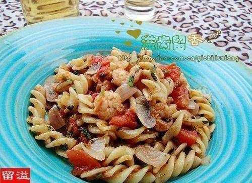 意大利螺旋面、虾、番茄、蘑菇、洋葱、高汤精、胡椒粉。