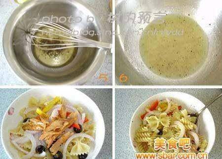 各种形状的混合意大利面100克(我用的是螺丝面和蝴蝶面)、红黄椒各适量(如果有青椒也放一点,颜色比较好看,我正好没有了所以没放)、洋葱1/4个、黑橄榄少许、罐装金枪鱼适量、橄榄油适量、白酒醋2大匙、盐少许、黑胡椒少许。