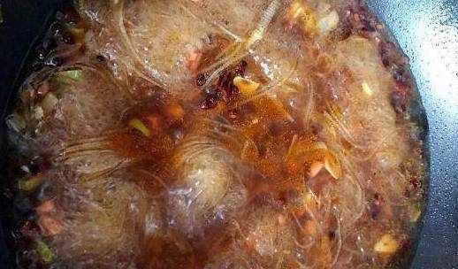 锅中加一点火腿丁、葱、姜末醋一起煮粉条,粉条煮成微微透明状就可以关火了。