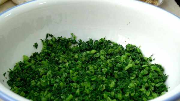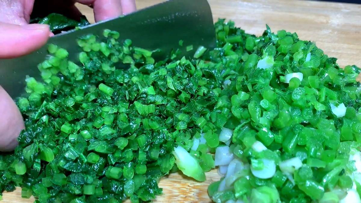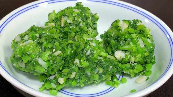 等不烫手后,再下手用力挤干水分,放在案板上,切成小碎沫,切好后装在盘子里。
