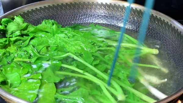 锅加水,大火把水烧开,水开后加一勺盐,搅拌一下,把食盐搅拌化开,再把茎部下锅焯水,时间不要太长,焯烫大约30秒,再把叶子放进来,搅动搅动,焯水半分钟,控水捞出,平铺均匀,放置温凉。