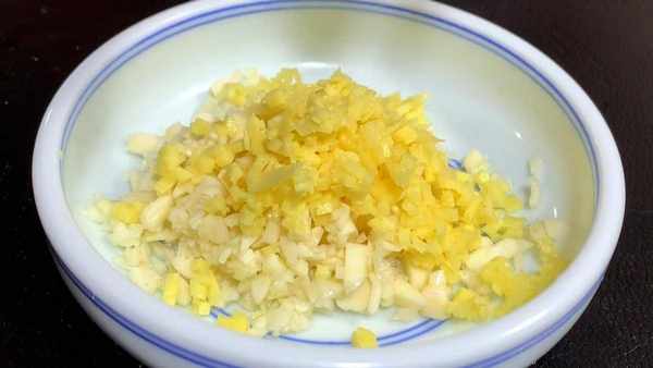 大蒜切成薄片,再剁成蒜末,生姜切成姜丝,切好后倒入碗中备用。