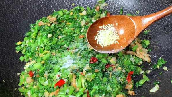 炒香后把萝卜缨放入锅中,开大火翻炒均匀,调味加入一点食用盐,鸡精,胡椒粉增香,继续开大火,快速翻炒均匀,翻炒20秒。