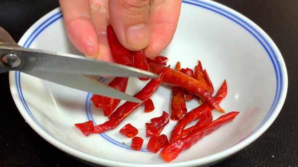 小碗中放入干辣椒,用剪刀剪成小段,直接放到蒜末里。