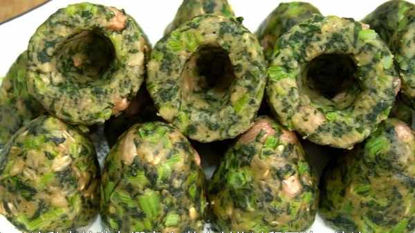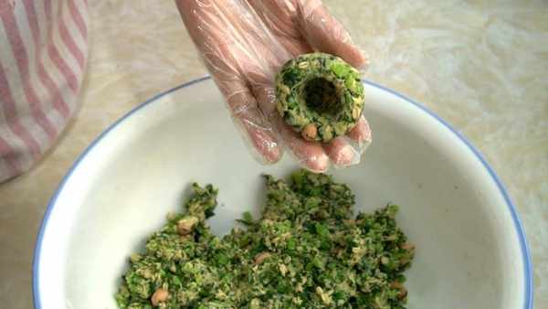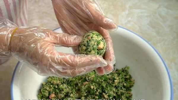 取一团馅料,在手心来回倒腾几下,整理成一个圆球。