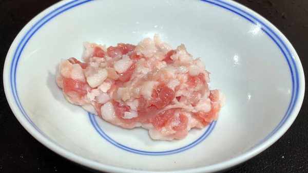 准备一块五花肉,切成薄片,再剁成肉末,剁得越细越好,肉末全部剁好后倒入碗中备用。