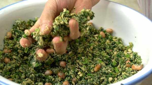再加入50克面粉,50克玉米面,50克黄豆面,搅拌一下,搅成面絮状,下手把馅料抓一抓,不用额外加水,抓至能成团就可以。
