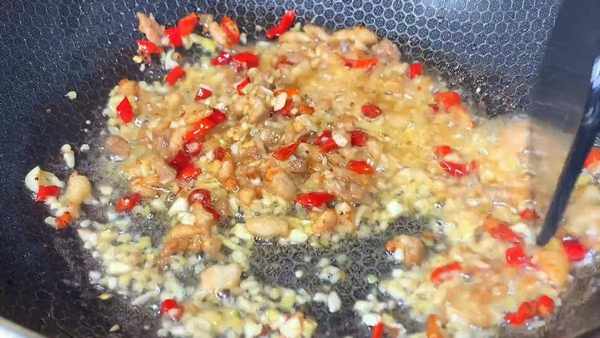 起锅加入食用油,油热后把五花肉放入锅中,开大火快速翻炒均匀,把肉末炒熟炒香,炒好后再加入一勺生抽酱油,继续翻炒,再把姜蒜末,干辣椒放入锅中,开大火快速翻炒均匀,炒出蒜香味和辣味。