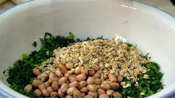 加一勺花椒粉,适量盐,100克提前浸泡过花生,60克洗干净燕麦片,先搅拌一下,把食材混合均匀。
