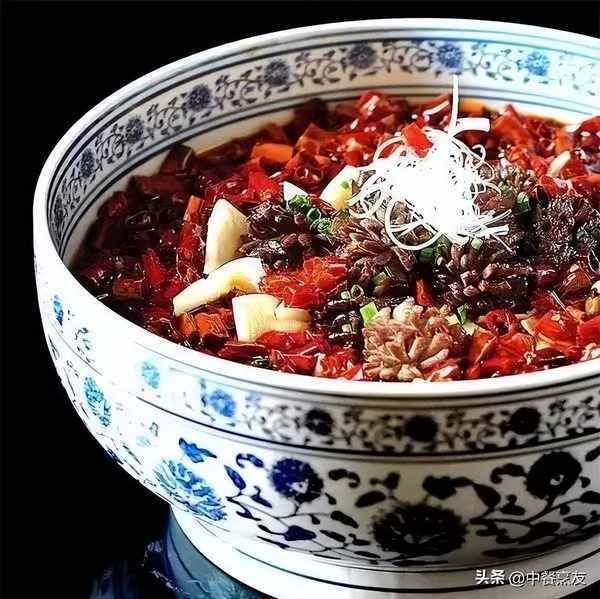 4.另取净锅放香辣油,烧热并投入花椒、干辣椒节炝香以后,舀在土钵里的菜肴上,最后点缀葱丝即可。
